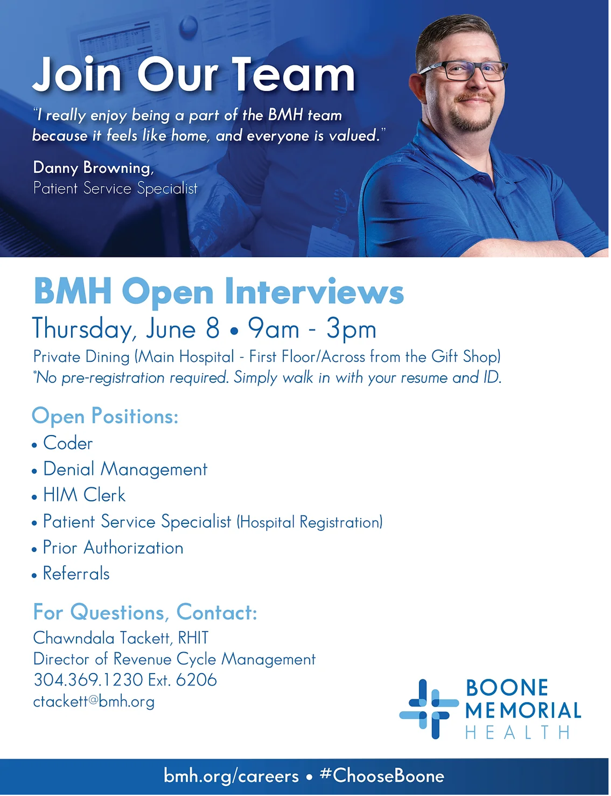 BMH is hosting Open Interviews on Thursday, June 8 at the main hospital campus, specifically for the following positions: Coder, Denial Management, HIM Clerk, Patient Service Specialist (Hospital Registration), Prior Authorization, and Referrals. Join the BMH Family!