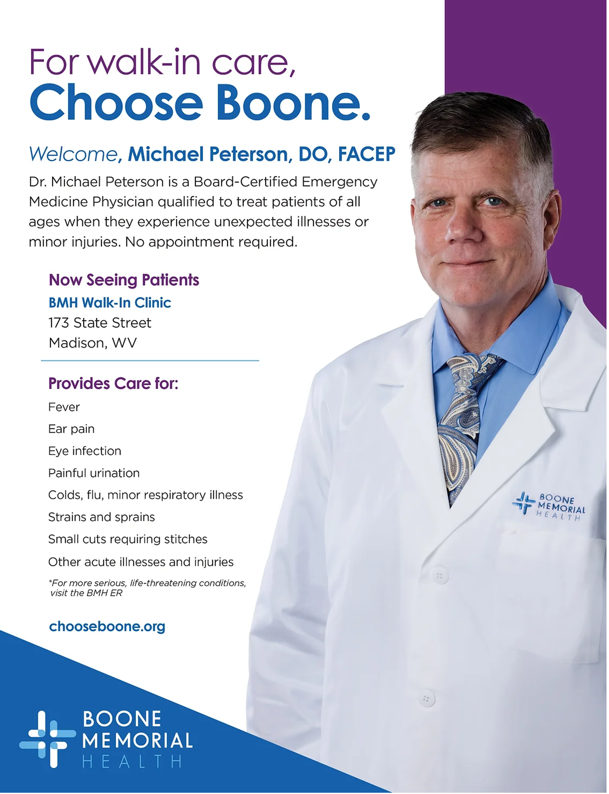 Boone Memorial Health is proud to welcome board-certified emergency medicine physician Michael Peterson, DO, FACEP, to our team! With extensive experience in emergency medicine and critical care transport, Dr. Peterson brings a wealth of knowledge and expertise to our Walk-In Clinic in Madison, where he is now seeing patients.